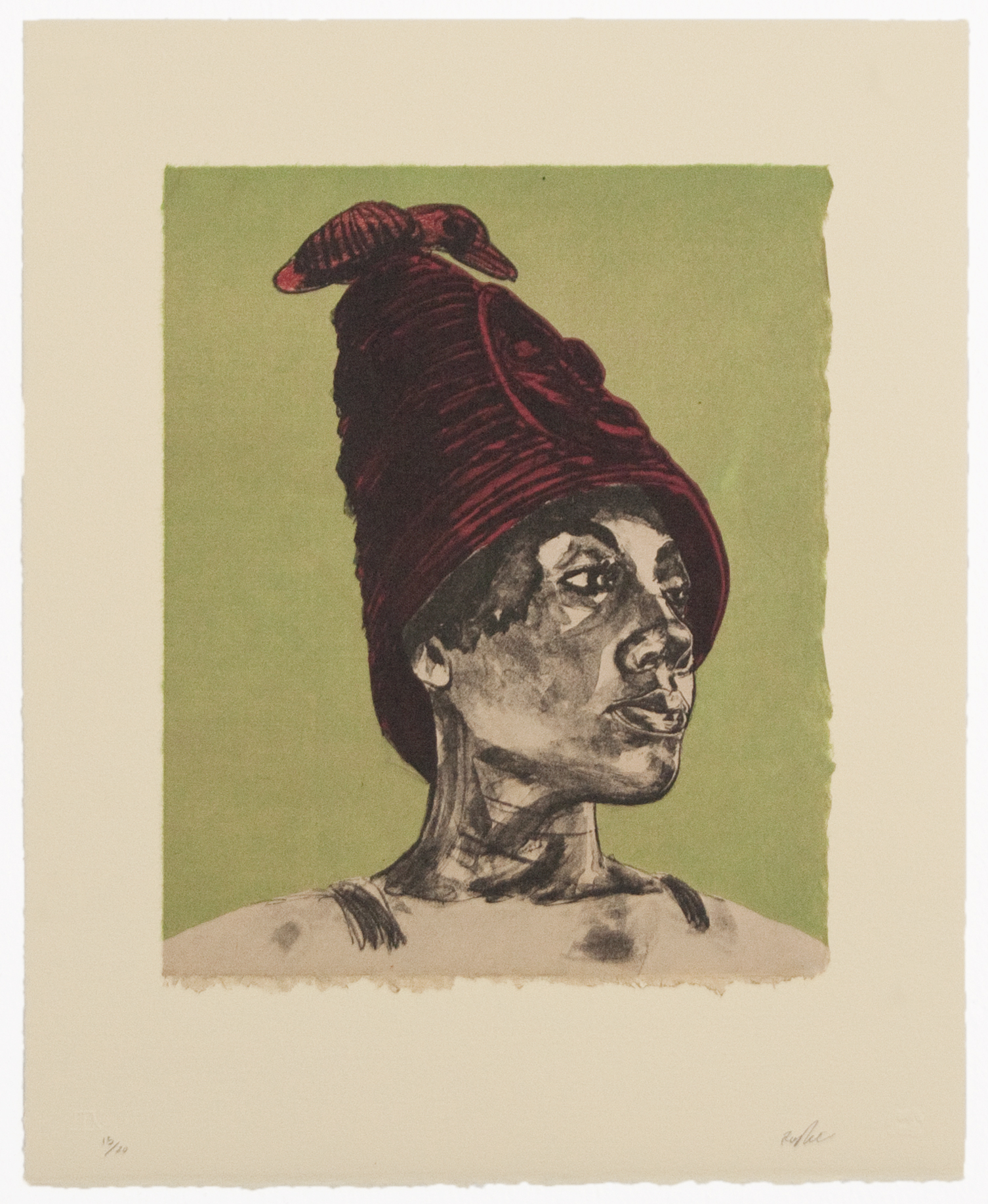 Three-color lithograph with hand-coloring and chine collé